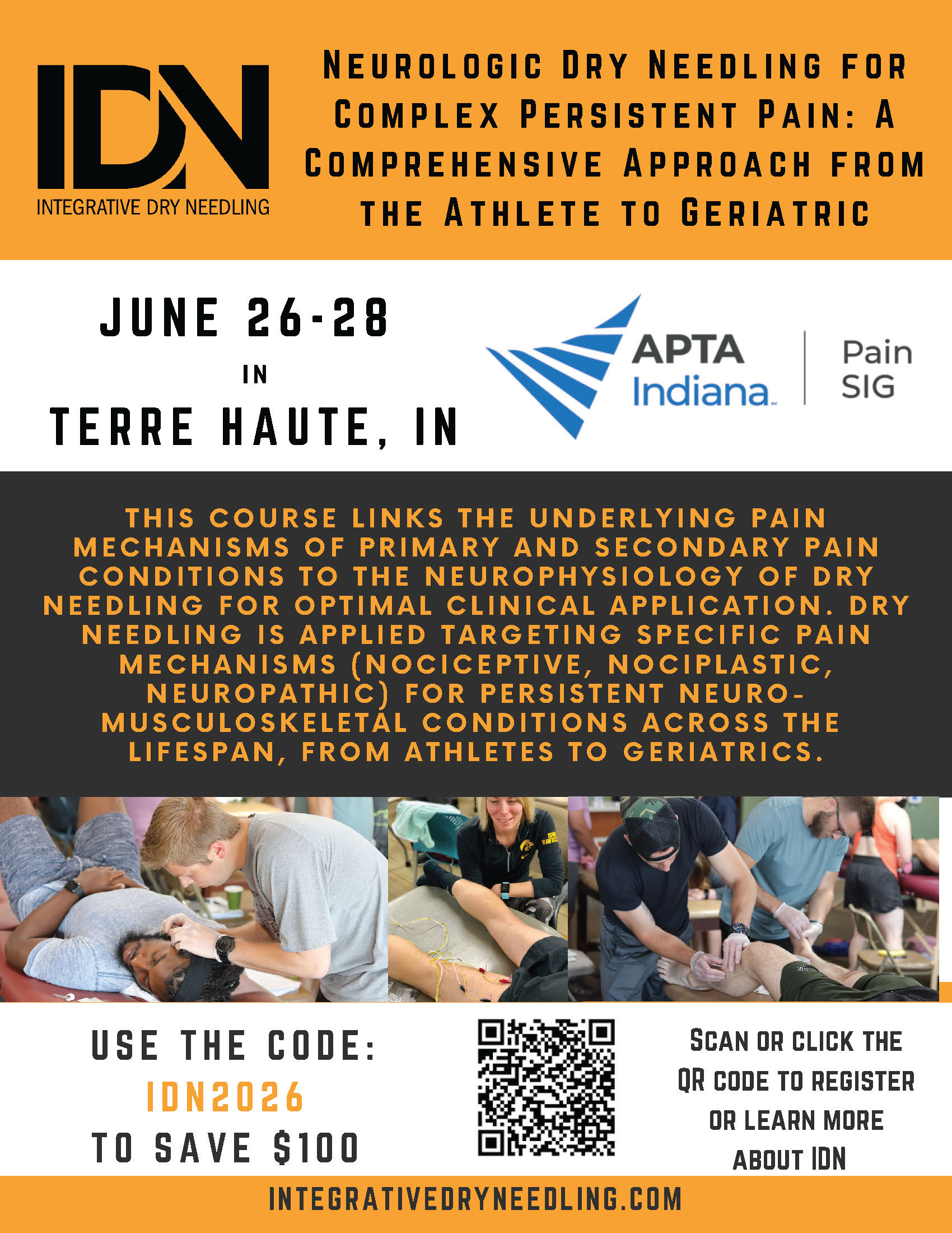 This course links the underlying pain mechanisms of primary and secondary pain conditions to the neurophysiology of dry needling for optimal clinical application. Dry needling is applied targeting specific pain mechanisms (nociceptive, nociplastic, neuropathic) for persistent neuro-musculoskeletal conditions across the lifespan, from athletes to geriatrics.